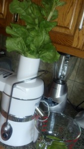 Collard Greens, Beets- stems & all, and some snap peas. It wasn’t as sweet as some of the other juices I make but it was a healthy little glass of vitamins.